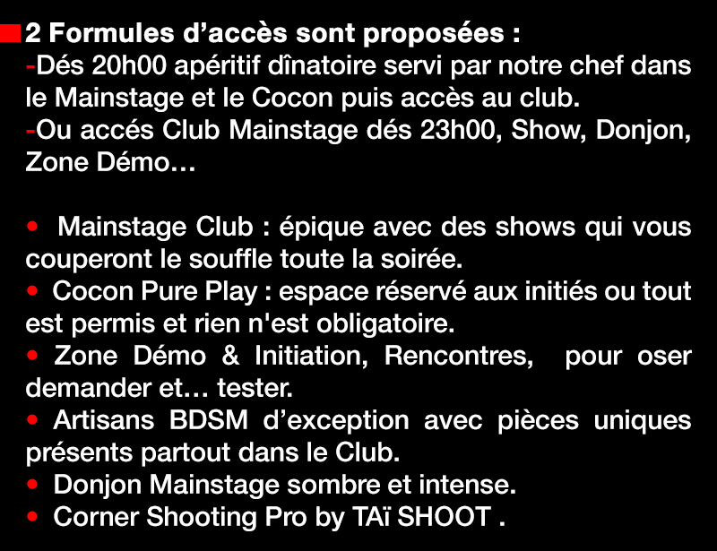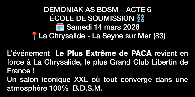 Démoniak as BDSM organise régulièrement au sein du Club la Chrysalide sur plus de 1000 M2 a La Seyne-sur-Mer , proche de Toulon , idéalement placé entre Marseille et Nice , Région PACA.